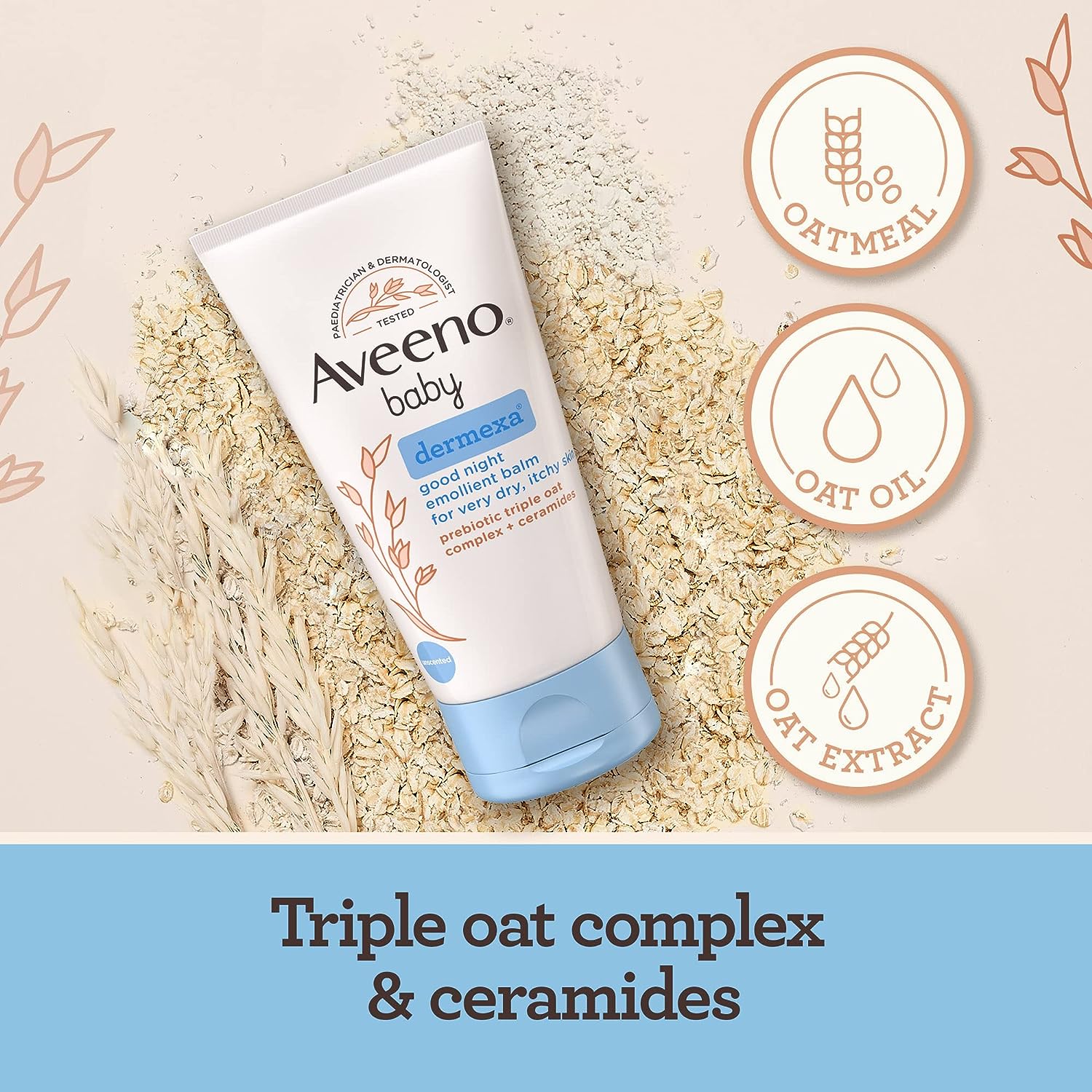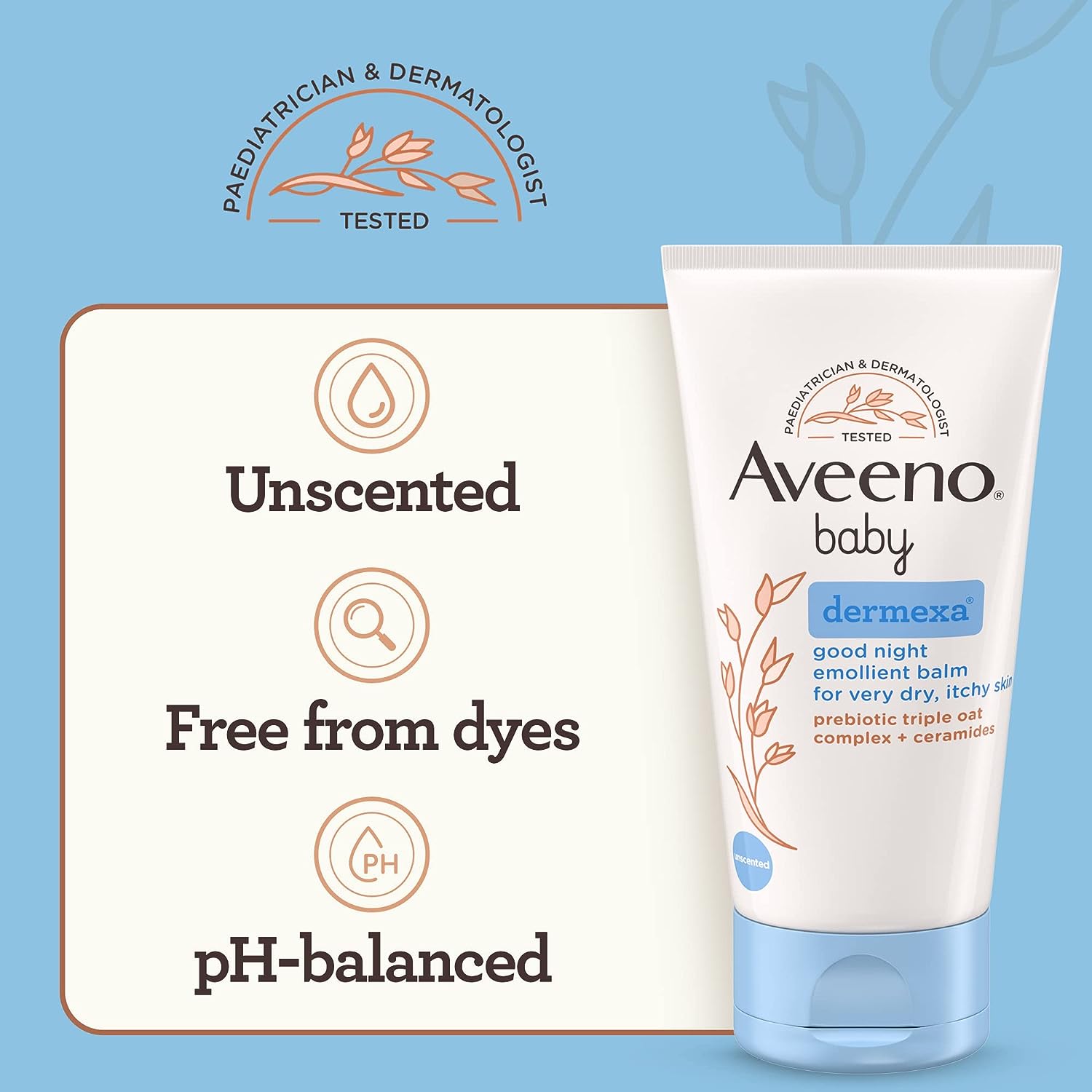 Aveeno Baby Dermexa Balm is a special bedtime balm that helps moisturize and soothe dry, itchy skin. It’s made with something called a triple oat complex, which includes oat extract, oat oil, and colloidal oatmeal. It also has ceramides. These ingredients work together to give immediate and long-lasting moisture to calm dry skin during the night. By using this balm before bed, you can help your baby’s skin feel better and less itchy. It’s a good choice for parents who want to help their baby’s dry skin with a gentle and effective product.