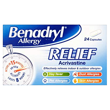 BENADRYL® Allergy Relief is the fastest-acting allergy relief capsule, it is the only brand to contain acrivastine a unique active ingredient. Acrivastine starts to work in 15 minutes providing fast relief.