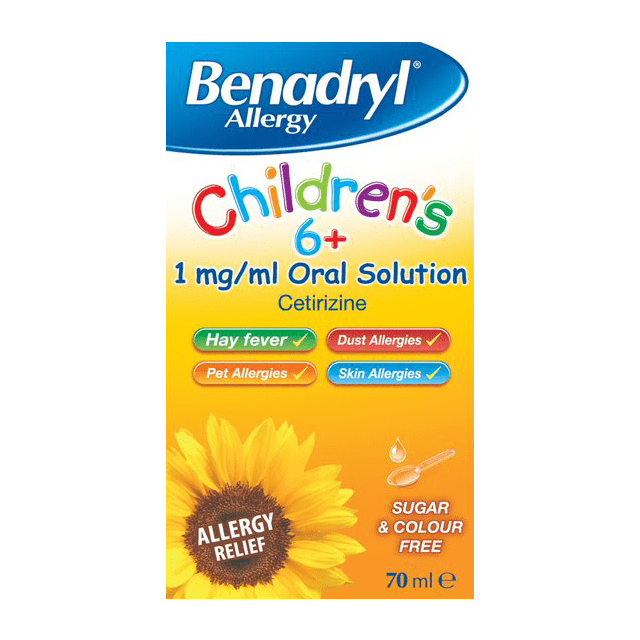 - Benadryl Allergy Children’s 6+ 1mg/ml Oral Solution is a medicine that is designed to treat both children aged 6 years and over, as well as adults.