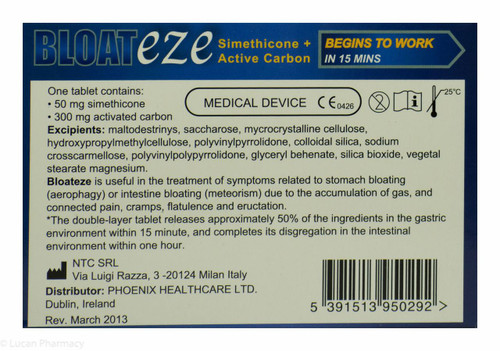 Bloateze 50mg tablets is a revolutionary medical device in tablet form, designed to provide relief from the uncomfortable symptoms associated with swallowing of air and intestinal distention. This powerful tablet is specifically recommended for the treatment of symptoms connected to stomach bloating or intestinal bloating caused by the accumulation of gas. Whether you are looking for relief from pain and cramps, or simply want to prevent flatulence and eructation, BLOATEZE has you covered. The efficacy of this device is due to the combination of simethicone’s anti-foaming action and the gas-absorbing action of carbon.