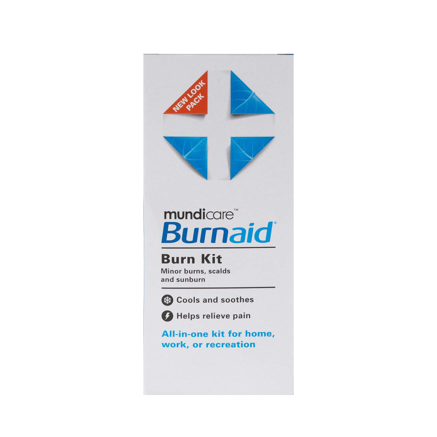 Burnaid Burn Kit contains mundicare Burnaid dressings and sachets of hydrogel for the first aid treatment of minor burns, scalds and sunburn.