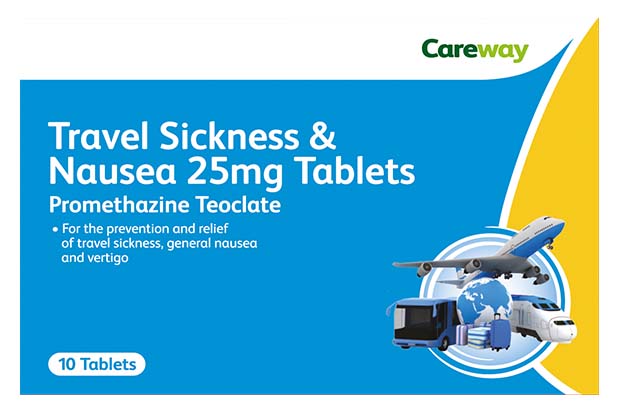 Careway Travel Sickness 25mg Tablets contain Promethazine for the prevention of travel sickness, general nausea and vertigo.