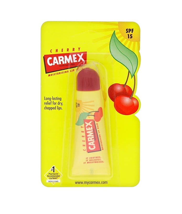 carmex moisturising lip balm cherry spf15 – 10g has unique formula which soothes, moisturises, and relieves, resulting in soft, healthy looking lips.