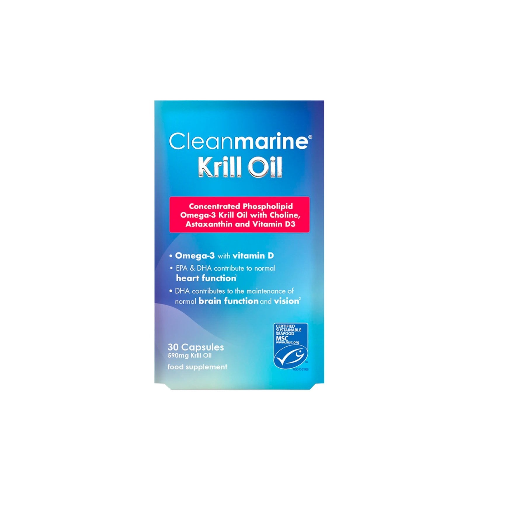 Ingredients: Euphausia superba 590mg, Astaxanthin (Naturally occurring), Cholecalciferol (VItamin D3)