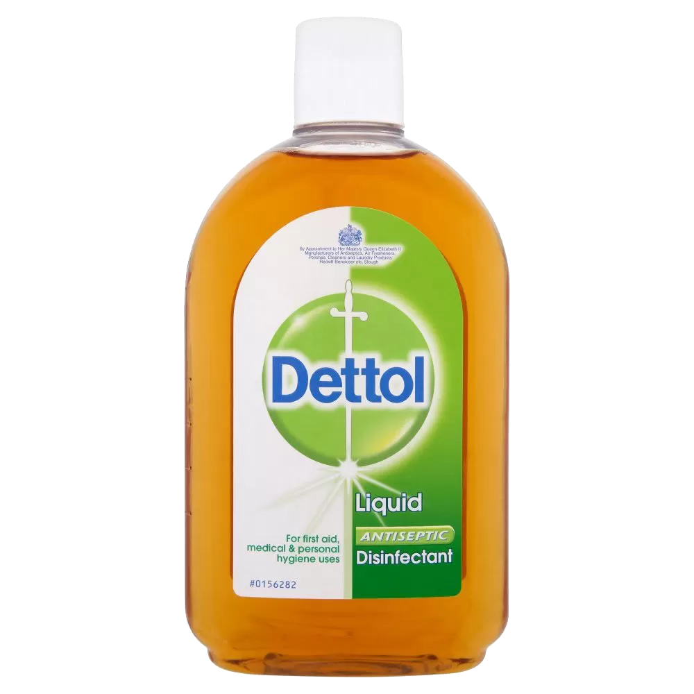 Dettol Liquid. For cuts, bites, abrasions and insect stings, dandruff, spots and pimples. Contains Chloroxylenol. Always read the label.