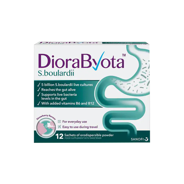DioraByota is a food supplement containing 5 billion extensively researched S.boulardii live cultures. These cultures are designed to reach the gut intact and support the levels of good bacteria in the gut. Fructo-oligosaccharides have been added as a source of dietary fiber that further help support gut bacteria. To complement the formula, vitamins B6 and B12 have been added, each contributing to the reduction of tiredness and fatigue. The powder is orodispersible, meaning DioraByota will dissolve in your mouth with no need for additional water, and is specially formulated as handy sachets for traveling.