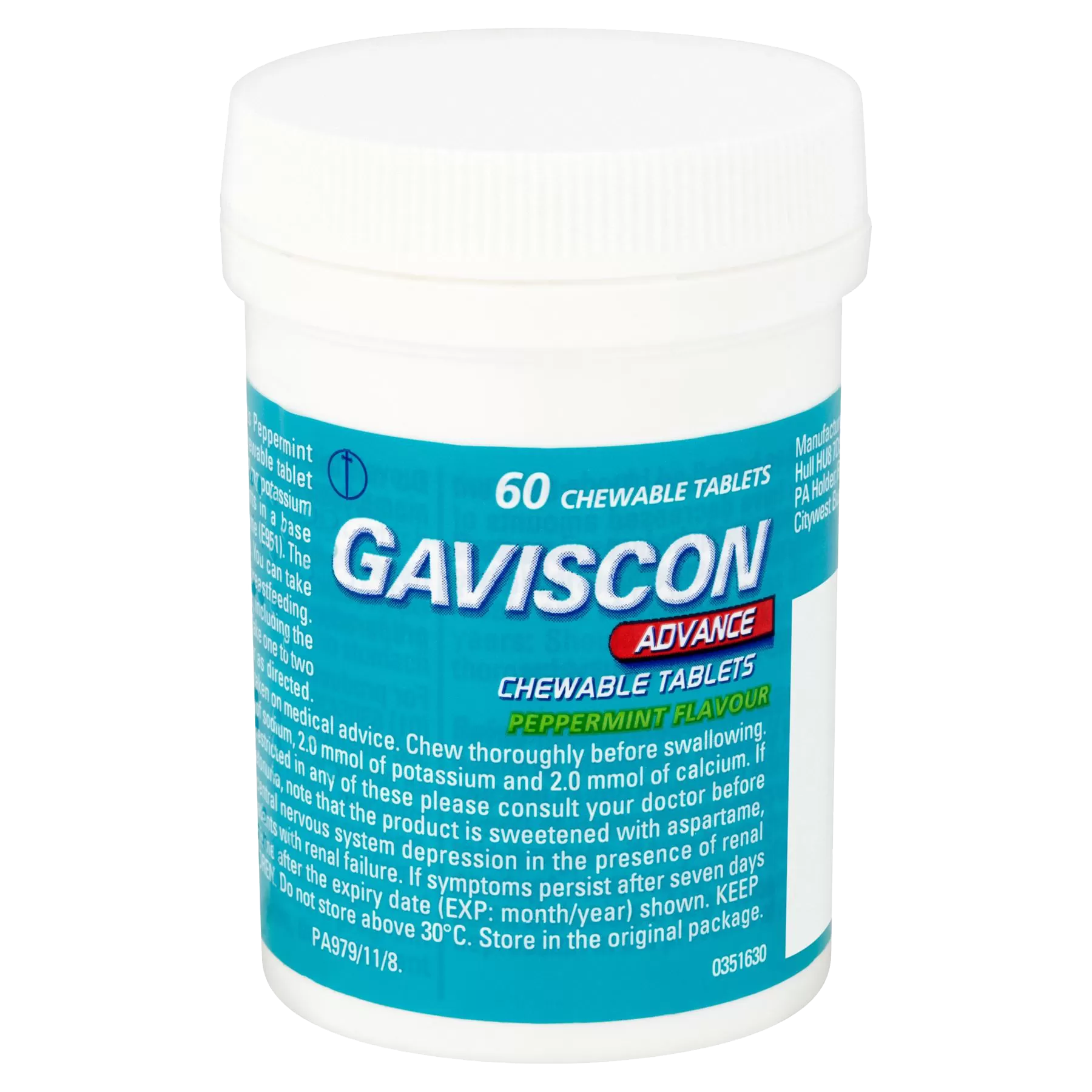 Gaviscon Advance Chewable Tablets Peppermint Flavour is an extra strength formula that works instantly to bring soothing relief from the pain of heartburn indigestion and reflux cough.