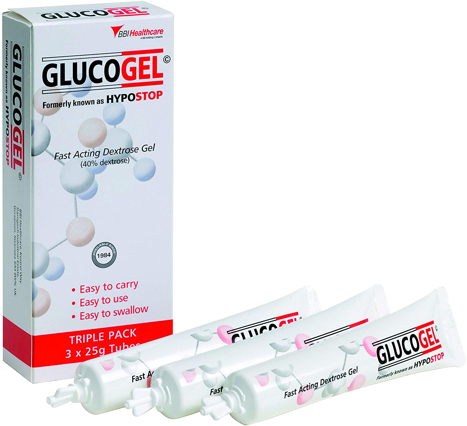 GlucoGel (formerly known as Hypostop) is a fast acting Dextrose Gel (40% dextrose) to raise blood sugar levels rapidly.