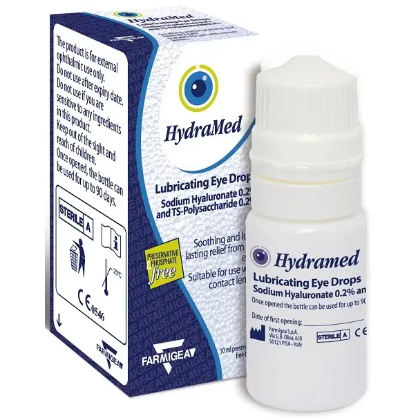 HydraMed is a sterile, preservative free moisturizing and lubricating ophthalmic solution containing protective substances; muco-mimetic and lubricant Sodium Hyaluronate and TS-polysaccharide with protective and balancing functions. HydraMed is presented as an eye drops solution in a preservative free bottle of 10 ml.