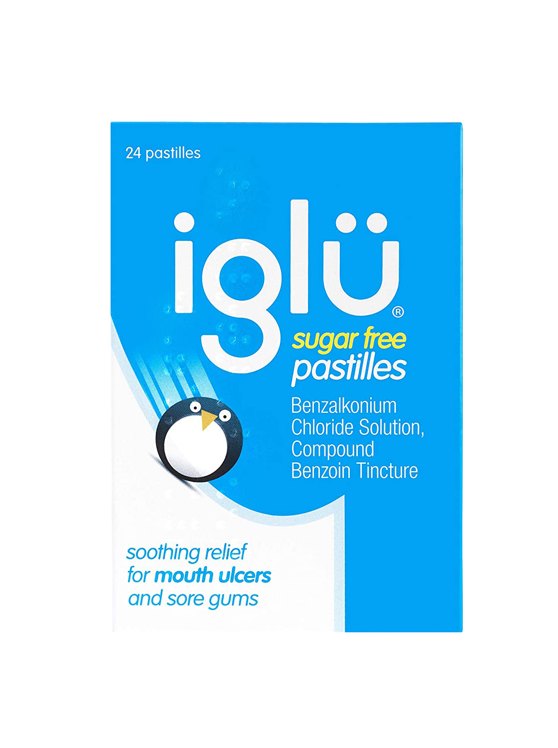 Iglu Sugar Free Pastilles contain two active ingredients, benzalkonium chloride solution and compound benzoin tincture. Between them, these ingredients have antiseptic properties, to help prevent infection and provide soothing relief as the pastille dissolves.