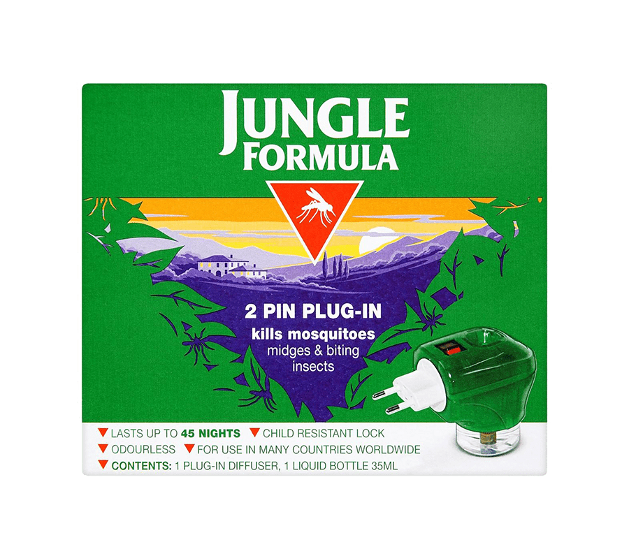Jungle Formula 2 Pin Plug-In Kit is a highly effective mosquito and insect killer that uses a specially formulated liquid to provide long-lasting protection against mosquitoes and other flying insects.