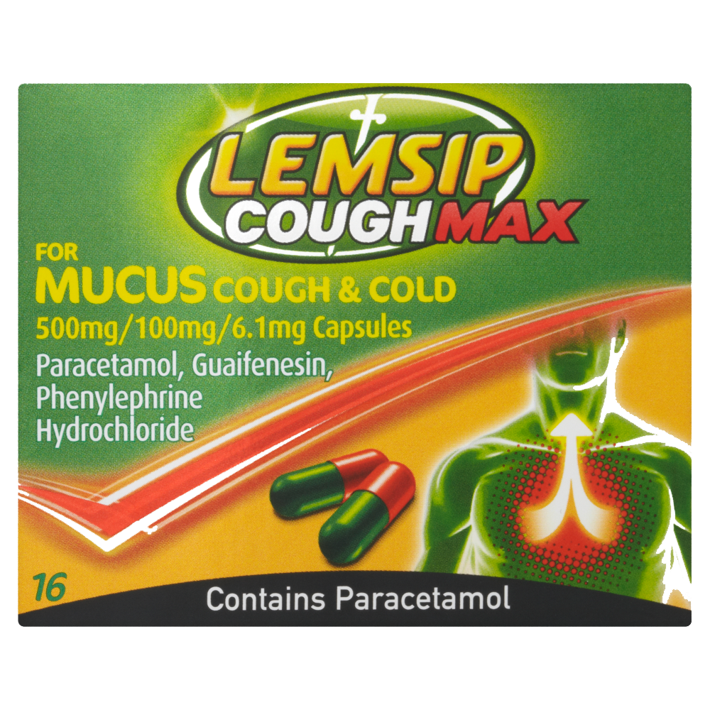Lemsip Cough Max For Mucus Coughs & Colds Capsules is used for relieving the symptoms of colds and flu, including chesty coughs, blocked nose and sinuses, sinus pain, fever, headache, aches and pains and sore throats. The capsules contain three active ingredients, paracetamol, guaifenesin and phenylephrine hydrochloride. Paracetamol is a simple painkilling medicine used to relieve mild to moderate pain and fever.