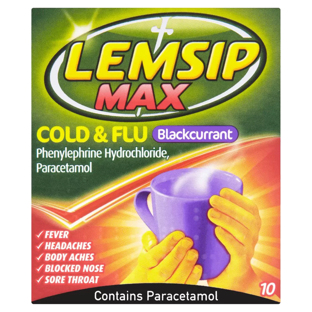 Lemsip Max Cold And Flu Blackcurrant Sachets These blackcurrant sachets from Lemsip are a fruity way to treat your cold and flu symptoms. They can be used to treat headaches, fever, blocked nose, sore throats and contains paracetamol for those uncomfortable body aches and pains. Fluids are very important when you are feeling ill so this hot blackcurrant drink also keeps your fluid levels topped up. This zesty flavoured drink should soon help you feel better and feeling more able to get on with your day.