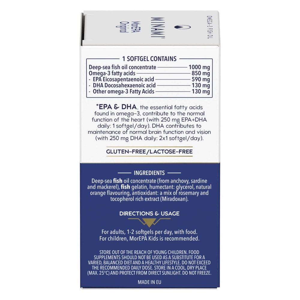 Minami MorEPA Softgels contains EPA & DHA, which is essential fatty acids found in omega-3, contribute to the normal function of the heart with 250mg of EPA + DHA. DHA contributes to maintenance of normal brain function and vision with 250 mg DHA daily.