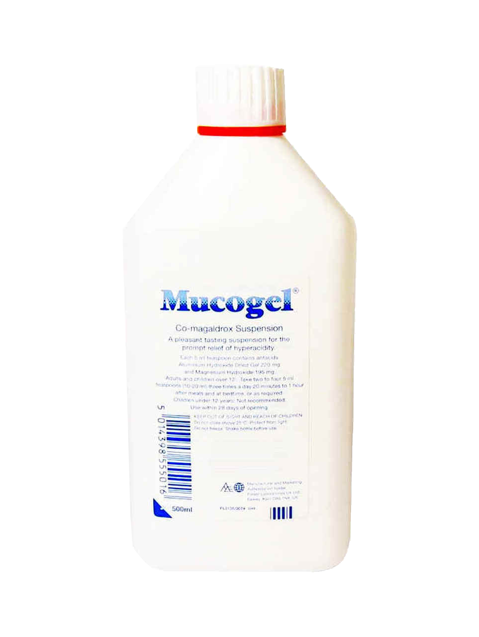 Mucogel is a mint flavoured oral suspension for the prompt relief of acid indigestion, upset stomach (gastritis), stomach or duodenal ulcers, reflux and heartburn.