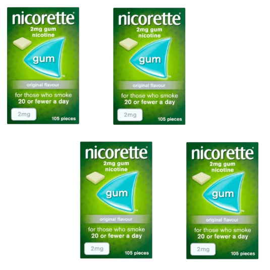 Nicorette 4mg Original Gum Four Pack (4 x 105 Pieces) is a multipack of original flavoured lozenges gums for nicotine replacement. They help boost your willpower to stop smoking through giving you controlled amounts of nicotine on a 6-month plan-basis.