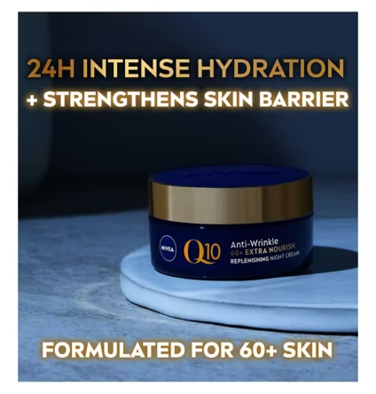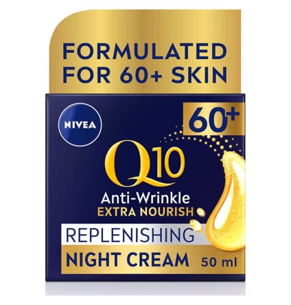 Nivea Q10 Anti-wrinkle extra nourish is a replenishing night cream that provides firm and smooth skin with Pure Q10 and organic Argan Oil for all skin types.