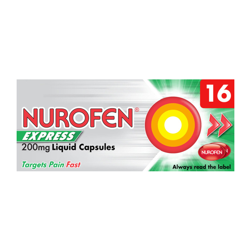 Nurofen Express 200mg Liquid Capsules release Ibuprofen immediately for fast pain relief of headaches, period pain, muscular and back pain.