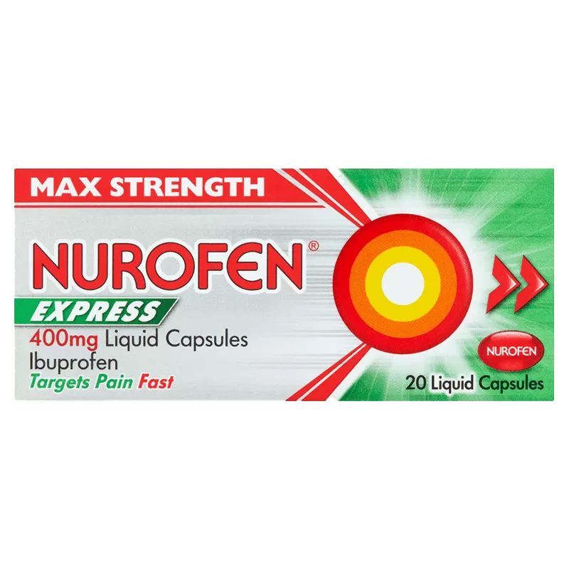Nurofen Express 400 mg Liquid Capsules is a non-prescription pain relief medicine containing ibuprofen, a non-steroidal anti-inflammatory drug (NSAID). It is formulated in a liquid capsule to allow faster release and absorption of ibuprofen in the body.