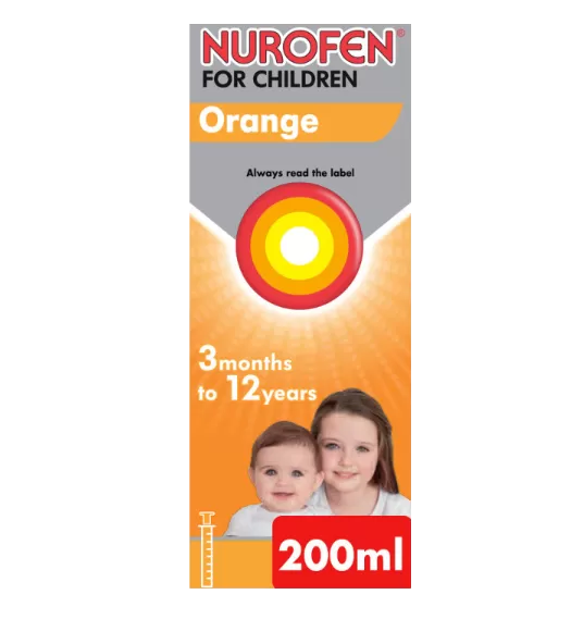 Nurofen for Children Orange 200ml is a liquid pain relief and fever-reducing medicine containing ibuprofen, a non-steroidal anti-inflammatory drug (NSAID). It is formulated in a strawberry-flavoured suspension that is suitable for use in babies and children aged from 3 months up to 12 years. The medicine helps relieve mild to moderate pain, reduce fever and high temperature, and alleviate symptoms associated with conditions such as headache, sore throat, toothache, earache, muscular pains, sprains or strains, and symptoms of cold and flu.