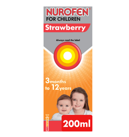 Nurofen for Children Strawberry 200ml is a liquid pain relief and fever-reducing medicine containing ibuprofen, a non-steroidal anti-inflammatory drug (NSAID). It is formulated in a strawberry-flavoured suspension that is suitable for use in babies and children aged from 3 months up to 12 years. The medicine helps relieve mild to moderate pain, reduce fever and high temperature, and alleviate symptoms associated with conditions such as headache, sore throat, toothache, earache, muscular pains, sprains or strains, and symptoms of cold and flu.
