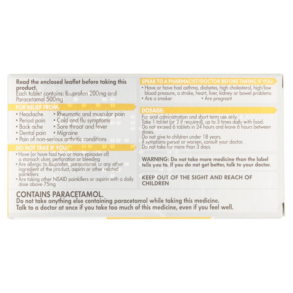 For the temporary relief of mild to moderate pain which has not been relieved by ibuprofen or paracetamol individually such as migraine, headache, backache, period pain, dental pain, rheumatic and muscular pain, cold and flu symptoms, sore throat and fever.