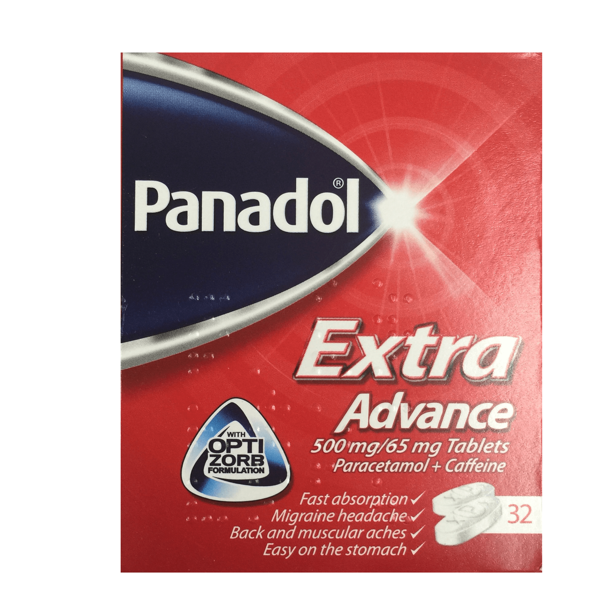 Panadol Extra Advance Tablets are faster absorbed than standard paracetamol and caffeine tablets. They are suitable for the relief of headache, migraine, backache, rheumatic pain, toothache and period pain.