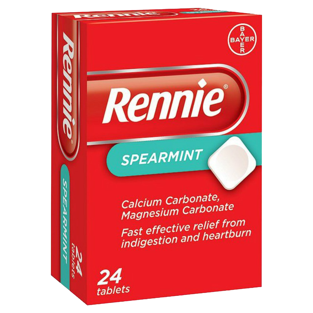 Rennie Spearmint provides fast and effective relief from heartburn and indigestion in a handy spearmint flavoured tablet. It contains magnesium carbonate and calcium carbonate, which work together to create an antacid that neutralize stomach acid.