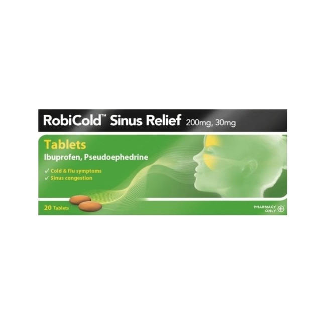 Robicold Sinus Relief Tablets 20 offer relief from symptoms from the common cold, flu and sinus congestion. Ibuprofen relieves headaches and fever, minor aches and pains and eases sore throats. Pseudoephedrine hydrochloride, a decongestant, relieves blocked noses and sinuses.