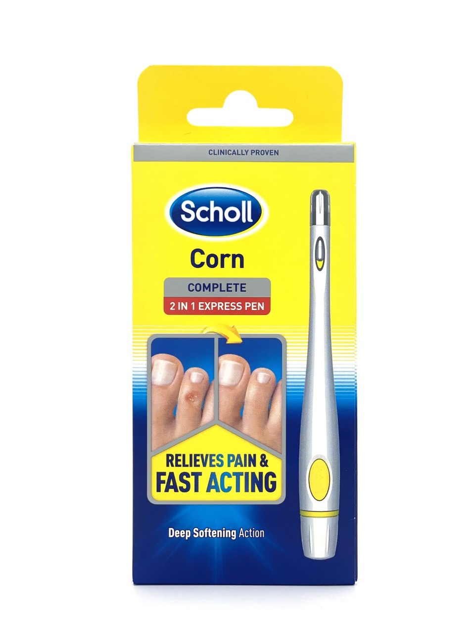Scholl 2 in 1 Corn Express Pen has a unique design: A scraper and an advanced treatment liquid in an all-in-one pen. The scraper is used to remove the surface layer of the corn and the advanced treatment liquid contains urea for deep softening action.