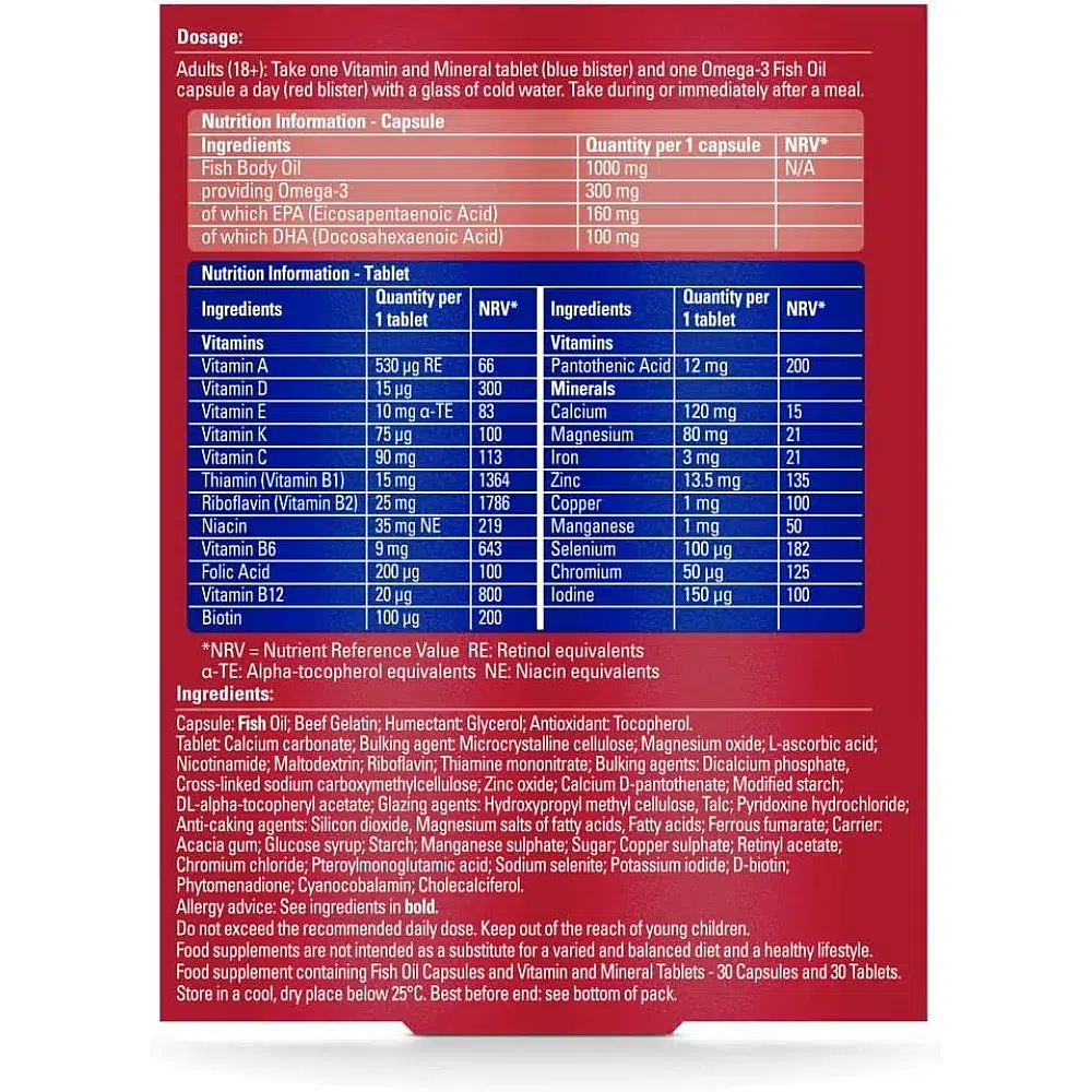 The multivitamin tablet boasts an impressive composition of 22 vitamins and minerals, including Vitamin B12, Vitamin D, Magnesium, and Zinc. These nutrients play vital roles in maintaining overall health. Additionally, the Omega-3 Fish Oil capsule contains 1000mg of responsibly sourced Fish Oil, with 300mg of highly beneficial Omega-3 that is easily absorbed by the body.
