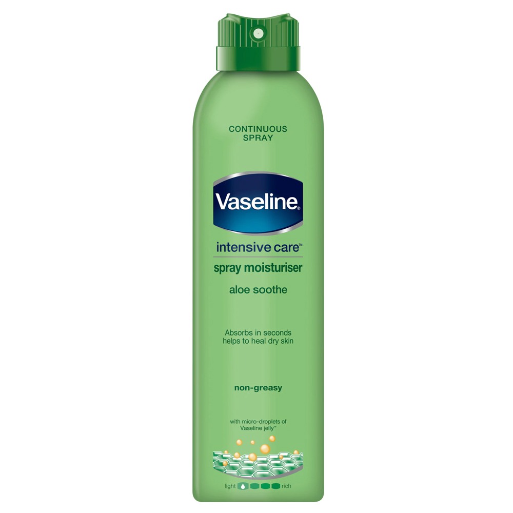 Vaseline Intensive Care Aloe Fresh spray moisturiser has a light, non-greasy formula which absorbs in seconds providing easy application. Contains microdroplets of Vaseline Jelly to lock in moisture. Non-aerosol, continuous spray lotion dispenses evenly for all-over coverage including areas that are hard to reach. Can be used as an after shower lotion to lock in moisture. Instantly leaves skin soft & fresh, not greasy or sticky. With aloe, known to soothe and calm dry, irritated skin.