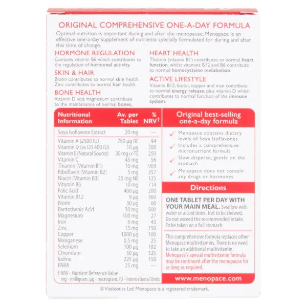 Scientifically formulated with 22 essential nutrients, Menopace Original offers effective nutritional support during and after the menopause. Vitamin B6 contributes to hormonal activity regulation, while thiamin (vitamin B1) supports normal heart function. The comprehensive formula contains moderate levels of Soya Isoflavone extract and vitamins B6 and B12, plus folate to help maintain healthy levels of the amino acid homocysteine, which is linked to heart health.