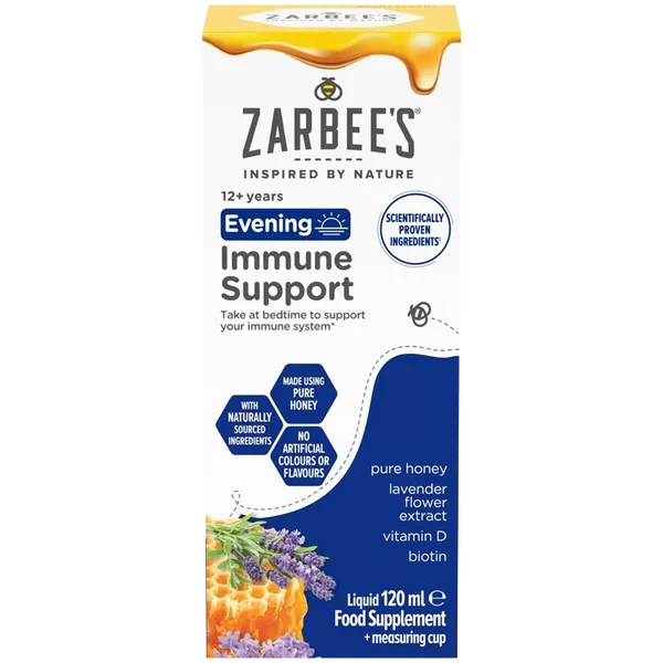 Zarbee’s Evening Immune Support contains scientifically tested and naturally sourced ingredients†. Each bottle of Zarbee’s Immune Support is made from almost 50% pure honey, with Vitamin D helps support your immune system, and biotin that contributes to the maintenance of mucous membranes around the body, including the throat and airways. We believe in the power of simple, curated ingredients and the lavender flower extract in our formula is naturally derived from the English Lavender variety. This immune support supplement is made with naturally sourced ingredients and is suitable for vegetarians, has no artificial colours or flavours and is made with almost 50% pure honey. Each 120ml bottle provides 24 daily servings of 5ml.